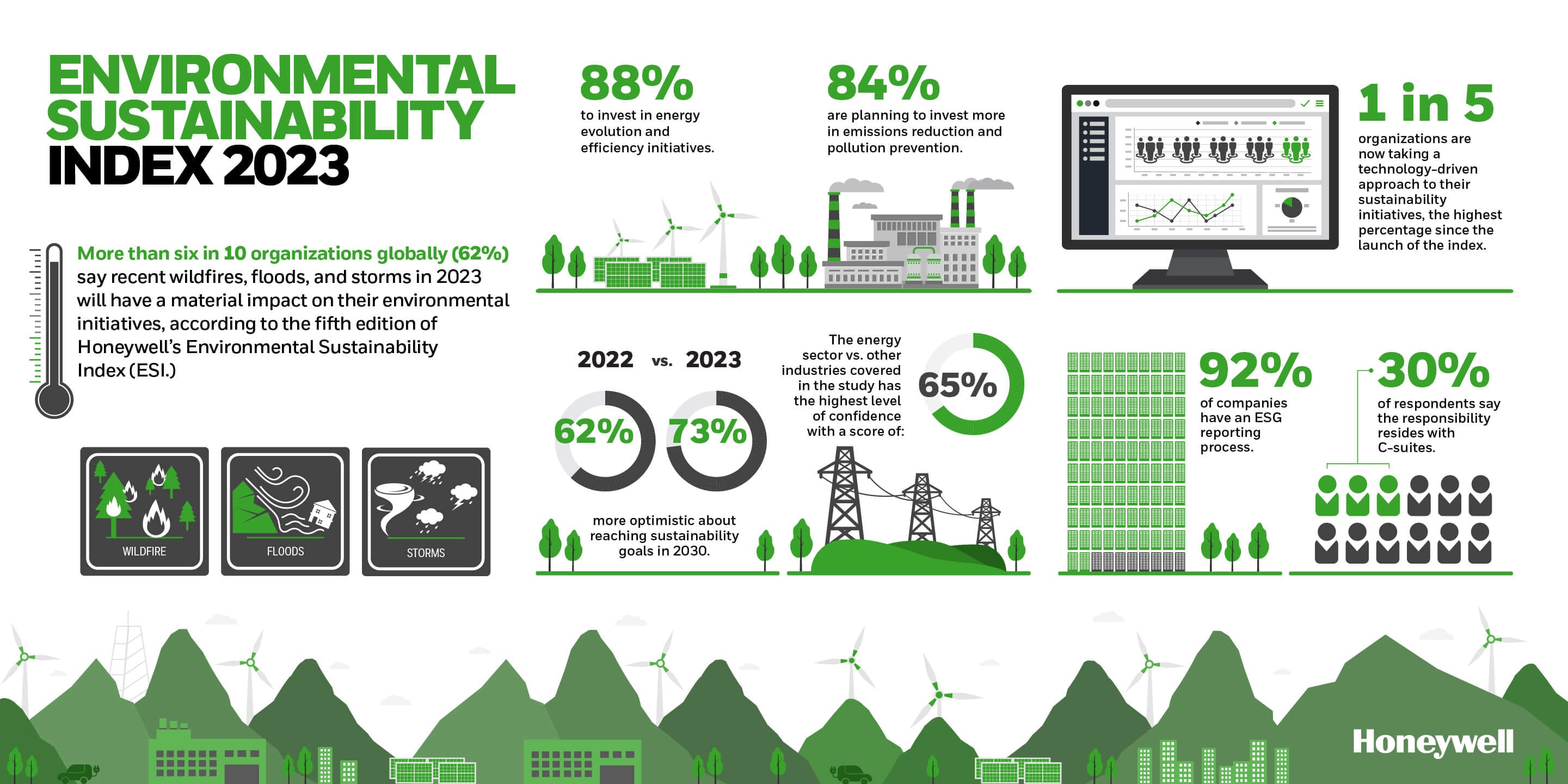 CHARLOTTE, NC, November 1, 2023 – More than six in 10 organizations globally (62%) say recent wildfires, floods, and storms during 2023 will have a material impact on their environmental initiatives, according to the fifth edition of Honeywell’s Environmental Sustainability Index (ESI.) Another 45% admit the extreme heat will have or has already had a material effect on their near-term plans. Compiled quarterly by Honeywell (NASDAQ: HON) and The Futurum Group, the ESI gauges movement in corporate sentiment and investment on the sustainability front.